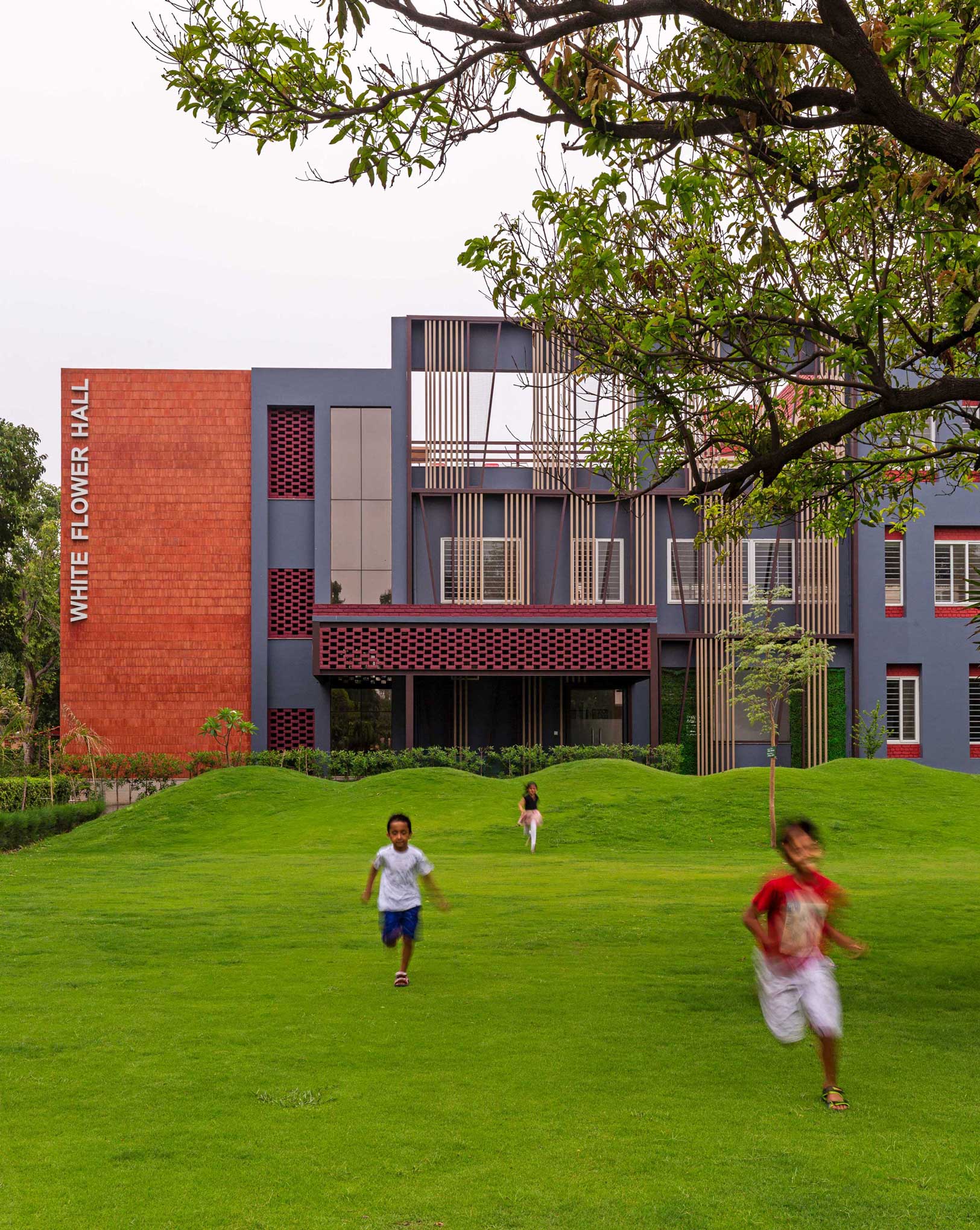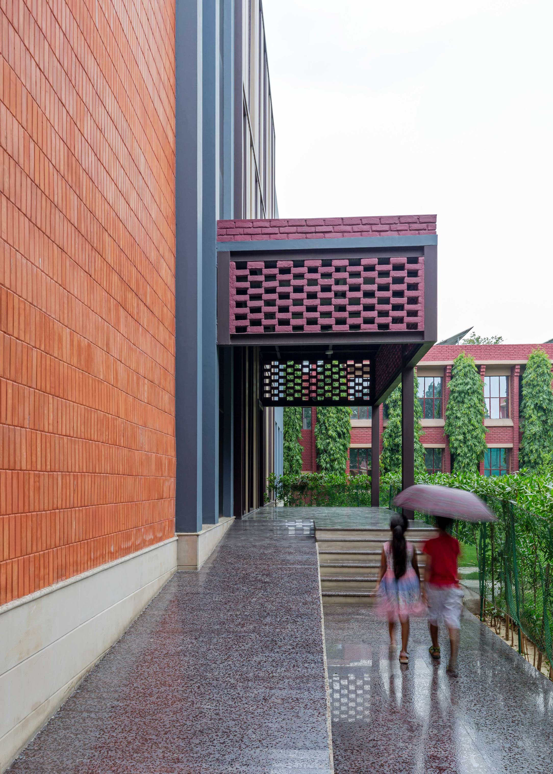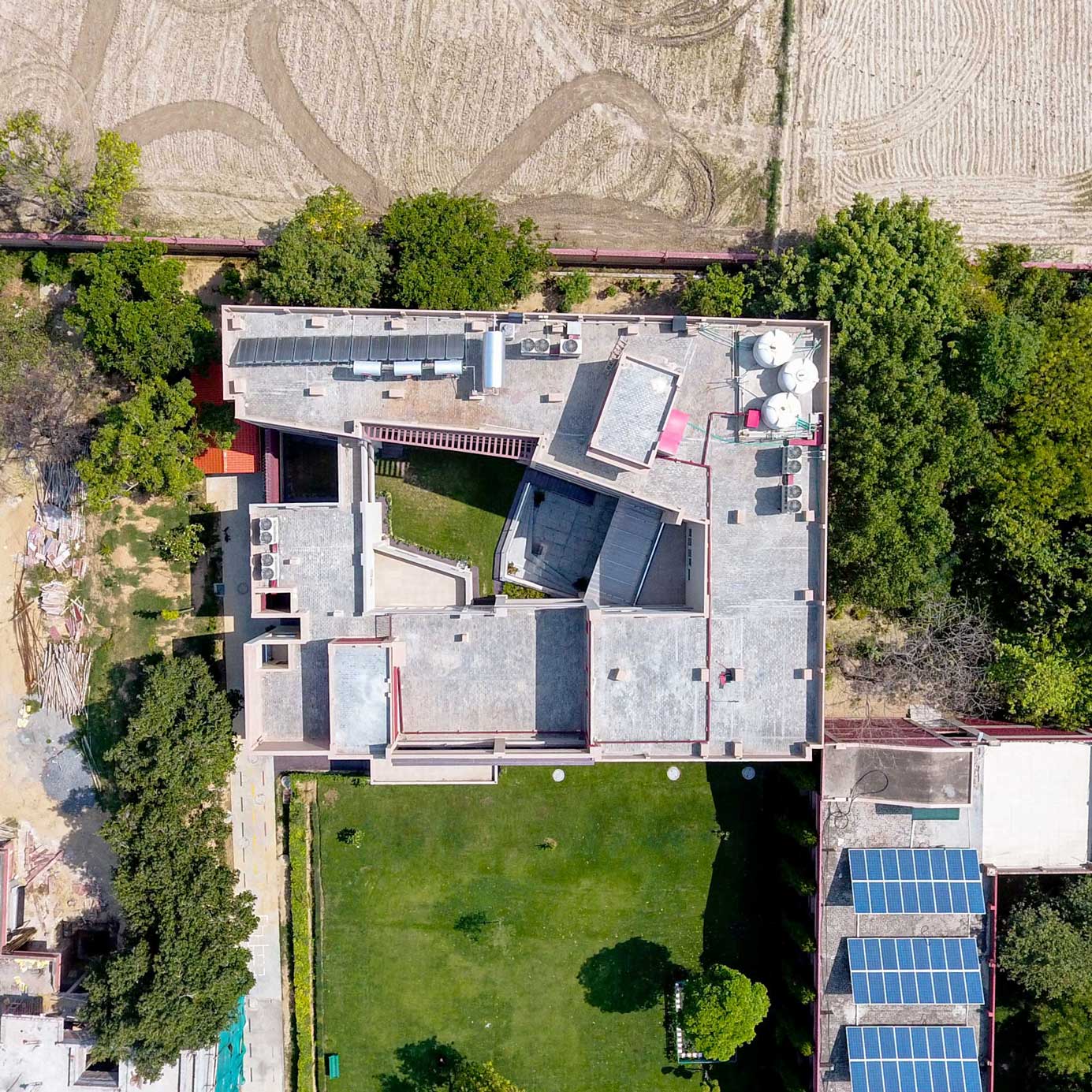 Driven by sustainability, solar panels are installed on the terrace of the building. The central courtyard is precisely aligned in the North West – South East direction, to catch the southwesterly winds during the monsoon, thus ensuring ventilation throughout the building. The South and West walls of the building are made with the rattrap bond (bricks are placed in a vertical position instead of conventional horizontal position, creating a cavity) to provide thermal comfort.  Mud phuska (compacted soil with hay) is used for thermal insulation to reduce the ingress of heat by almost 70%. Bricks used on-site have been procured from local kilns to reduce the carbon footprint. Even the finishes and materials used in the building are low maintenance and affordable – paint and tiles, granite, laminates on the door – all keeping in mind that the setting is to be used by young children. All the site-excavated earth from the basement is used to level and create mounds in the garden in front of the girl’s hostel. The debris that came out of the construction material was utilised to make the roads and footpaths of the school. Timber from old trees withering away on site was used to manufacture doors for the building. Additionally, rainwater is harvested from the 650 sqm terrace into two pits through a series of drains and used for horticulture and flushing.