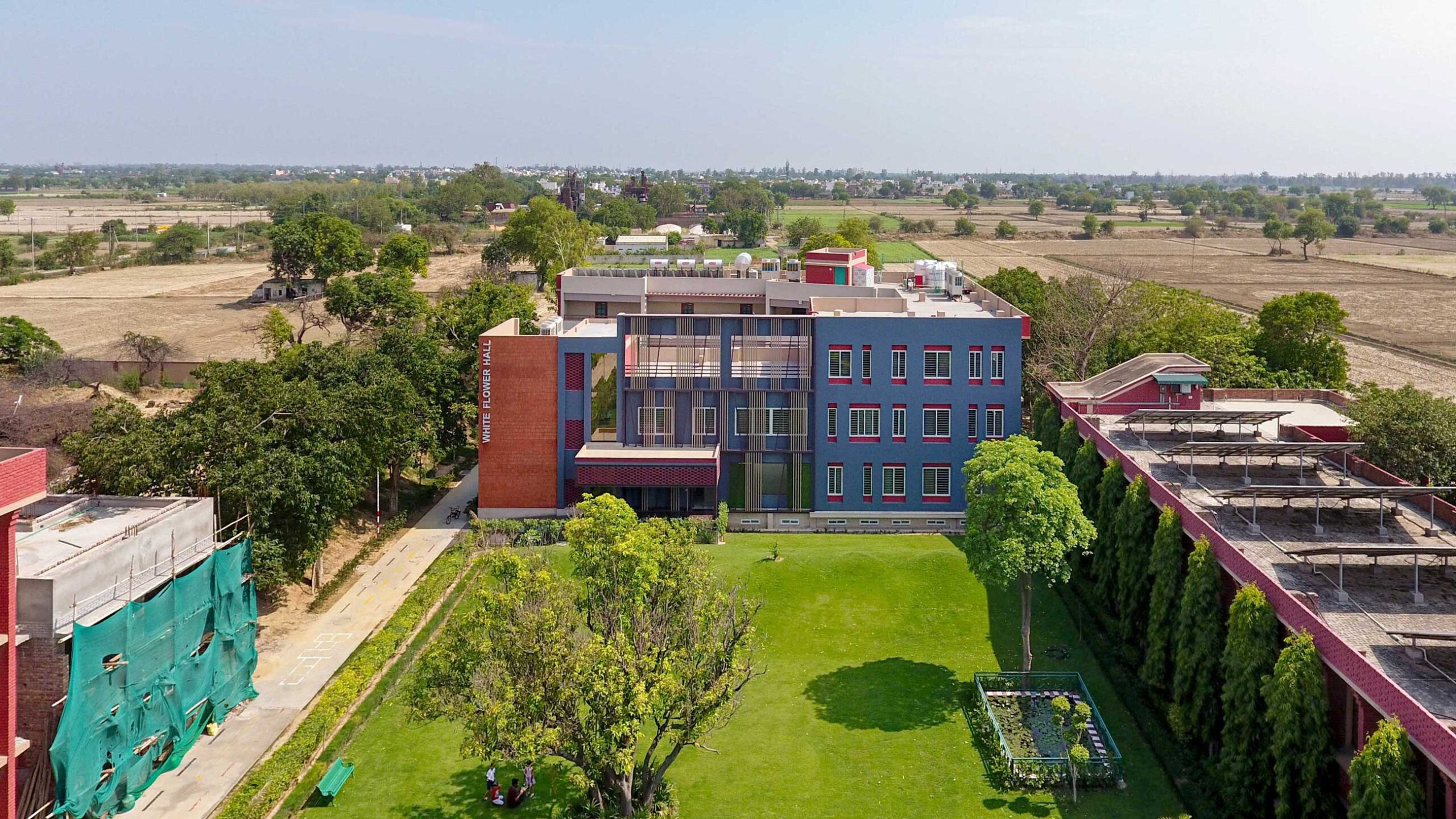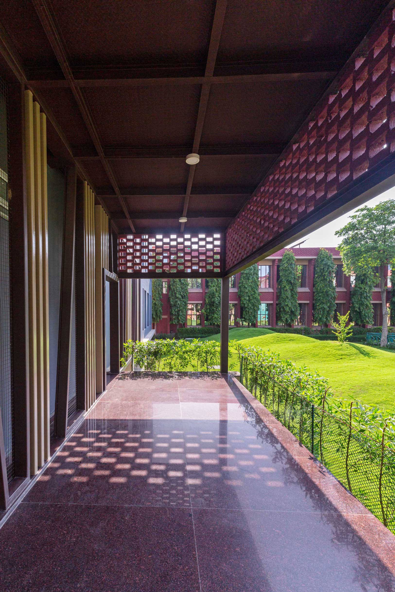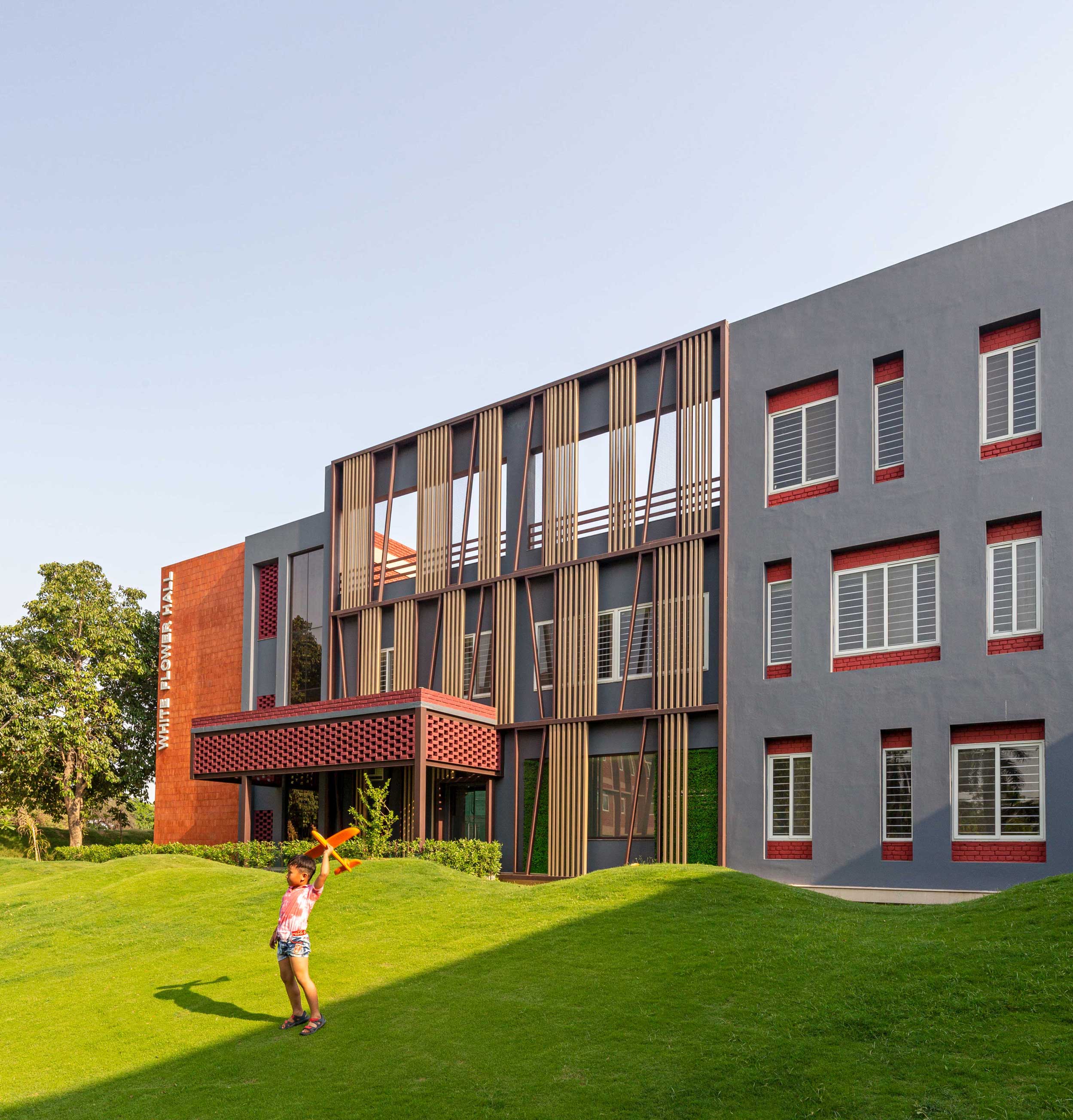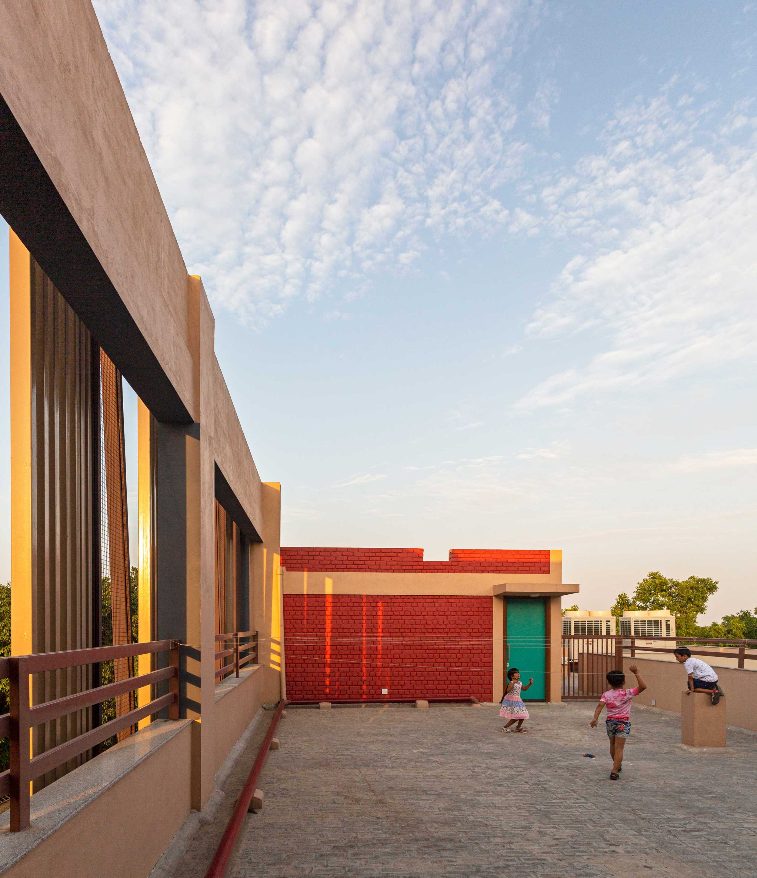Driven by sustainability, solar panels are installed on the terrace of the building. The central courtyard is precisely aligned in the North West – South East direction, to catch the southwesterly winds during the monsoon, thus ensuring ventilation throughout the building. The South and West walls of the building are made with the rattrap bond (bricks are placed in a vertical position instead of conventional horizontal position, creating a cavity) to provide thermal comfort.  Mud phuska (compacted soil with hay) is used for thermal insulation to reduce the ingress of heat by almost 70%. Bricks used on-site have been procured from local kilns to reduce the carbon footprint. Even the finishes and materials used in the building are low maintenance and affordable – paint and tiles, granite, laminates on the door – all keeping in mind that the setting is to be used by young children. All the site-excavated earth from the basement is used to level and create mounds in the garden in front of the girl’s hostel. The debris that came out of the construction material was utilised to make the roads and footpaths of the school. Timber from old trees withering away on site was used to manufacture doors for the building. Additionally, rainwater is harvested from the 650 sqm terrace into two pits through a series of drains and used for horticulture and flushing.