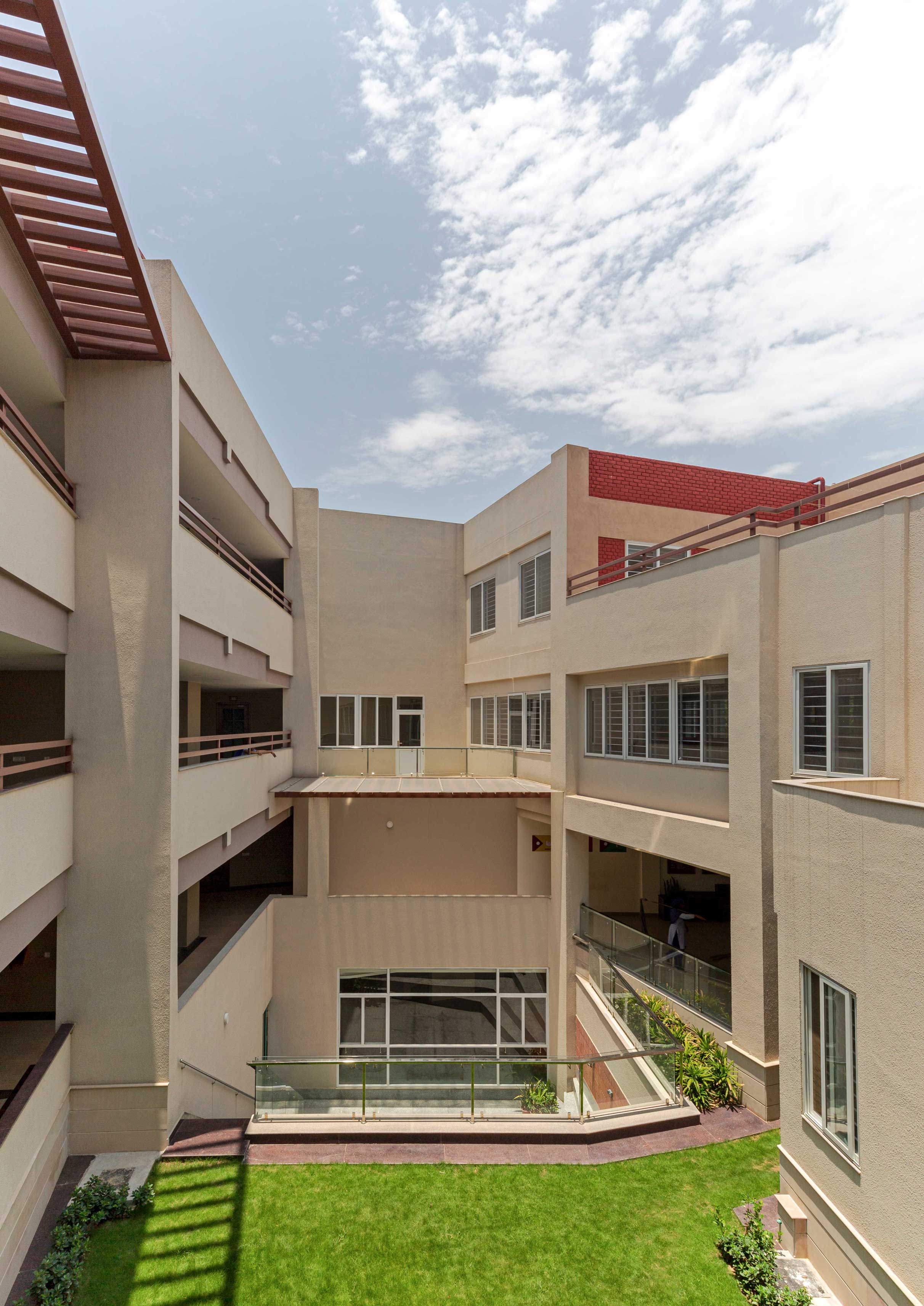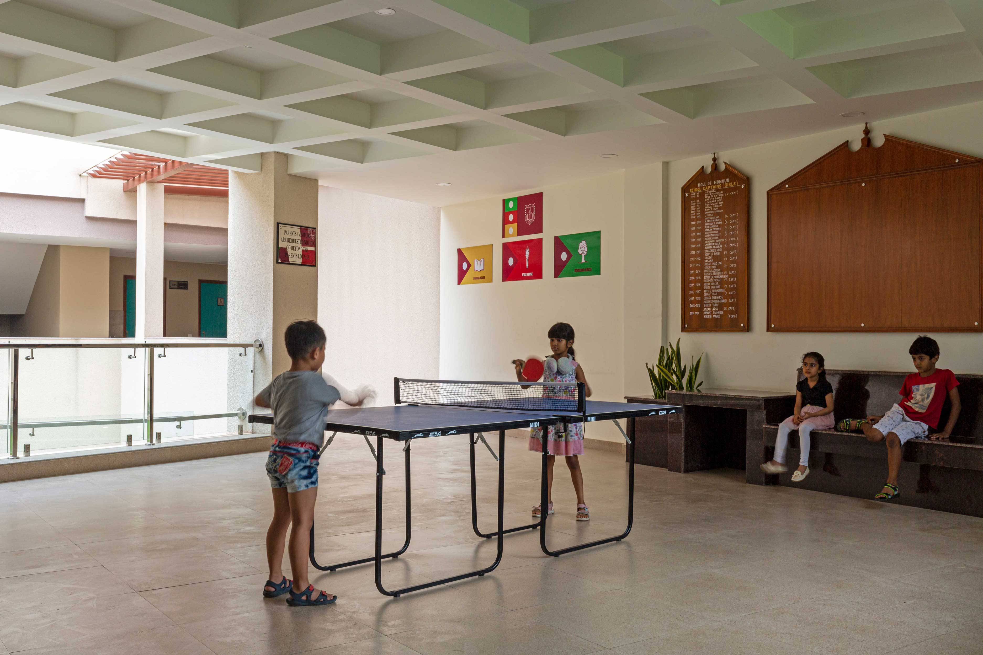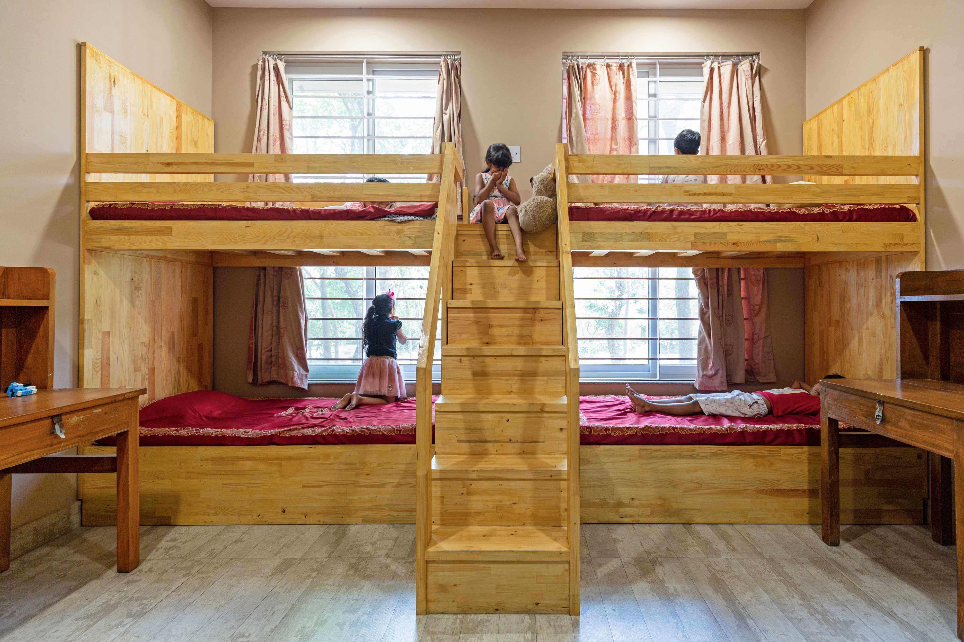 The residential facilities for younger kids (grade 1 to 4), have been planned on the ground floor avoiding the need to climb stairs and ensuring safety. The dormitories are designed to ensure optimal ingress of daylight and ventilation with windows along the custom-designed bunk beds, allowing each child with a view to the outside. The dining area, the parent’s lounge, as well as recreational spaces like the indoor play area are also located on the ground floor. The first and second floors, on the other hand, are dedicated to facilities for older students: 4-bedded and 6-bedded dormitories with individual beds and study areas. The infirmary and the salon are also positioned on the first floor to accommodate all the facilities in one place, making the hostel self-sufficient