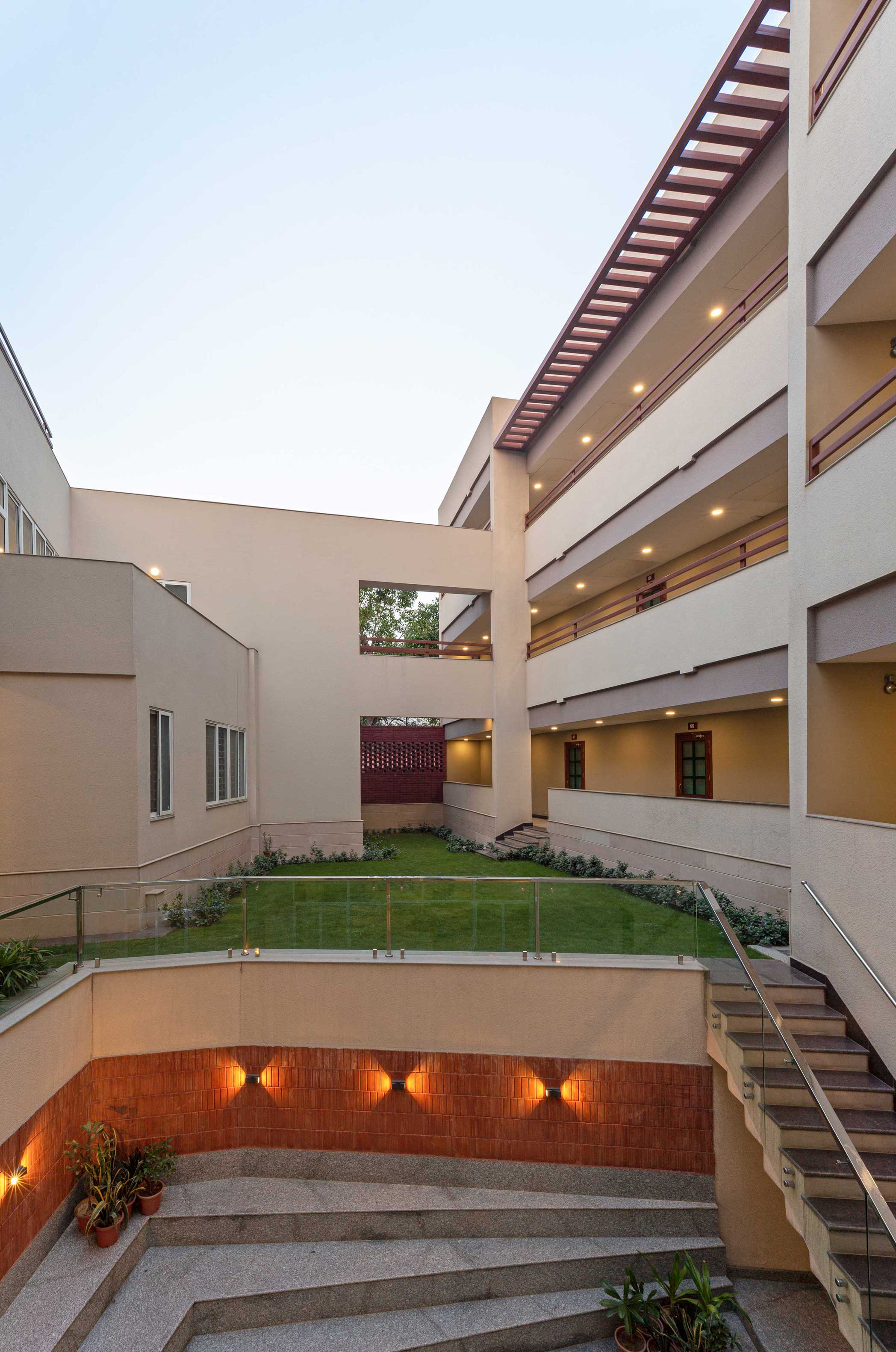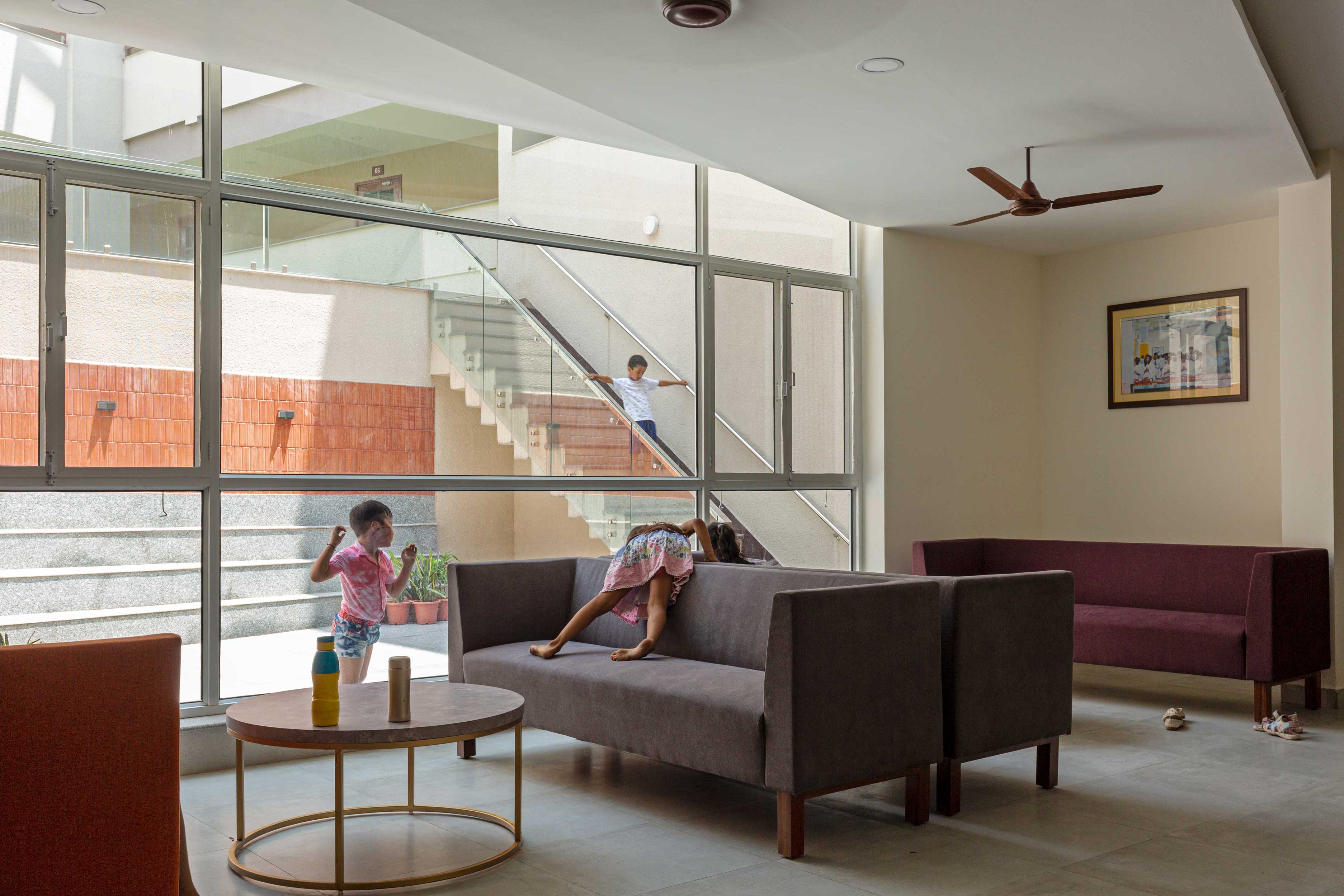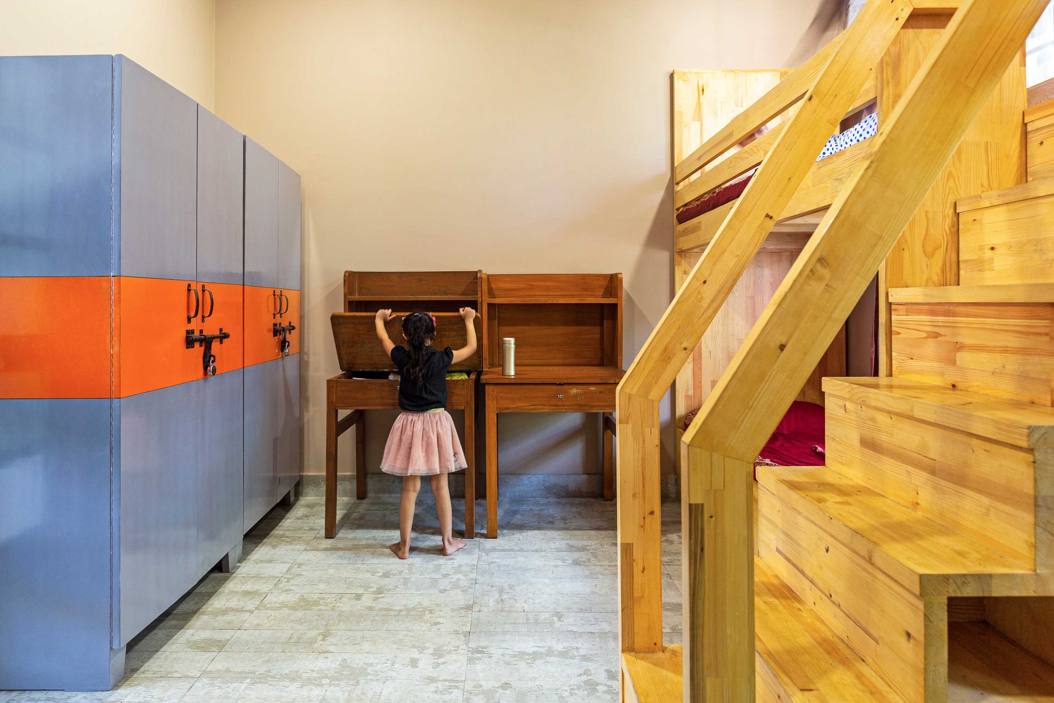 Activity areas like the common room, computer lab, and the games room are planned in the basement around the central courtyard and the sunken amphitheater, making it the liveliest zone in the building. The amphitheater has been designed as an extension of the common room, also functioning as a congregation spot where students and staff often come together to celebrate events or special occasions.  In order to ensure a nourishing and emotionally supportive  environment for the children, safety has been considered  as an essential part of the design. The warden’s residence is planned within the building, overlooking the central courtyard, while giving her a complete view of the hostel from her living room while retaining a sense of privacy. The number of building entry and exit points are reduced, windows are fitted with metal grills, and  wires are used between the handrails in the corridors and the ceiling as a precaution.