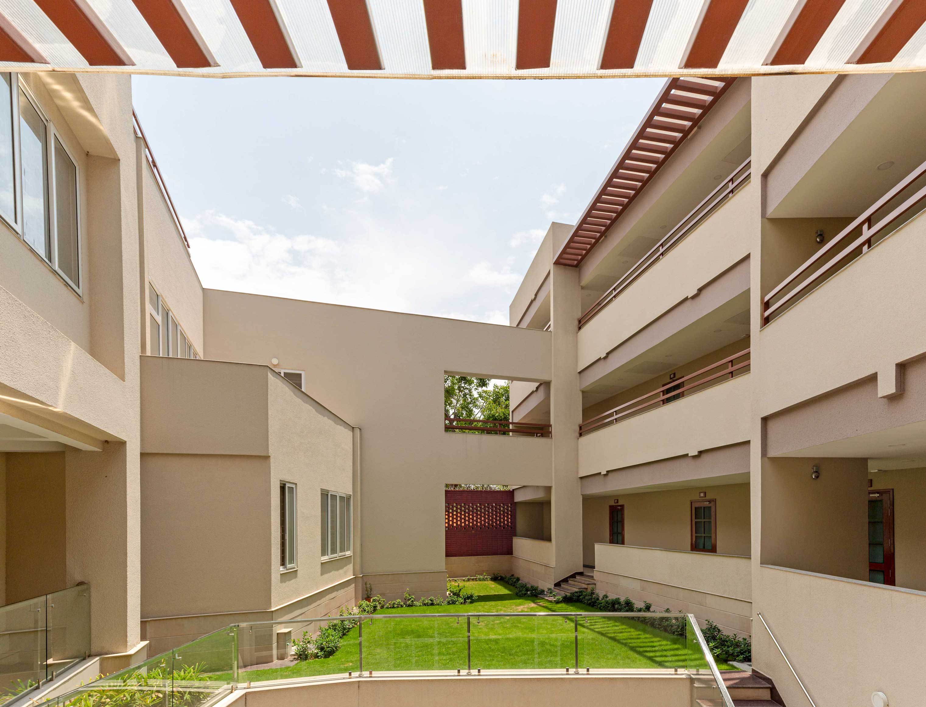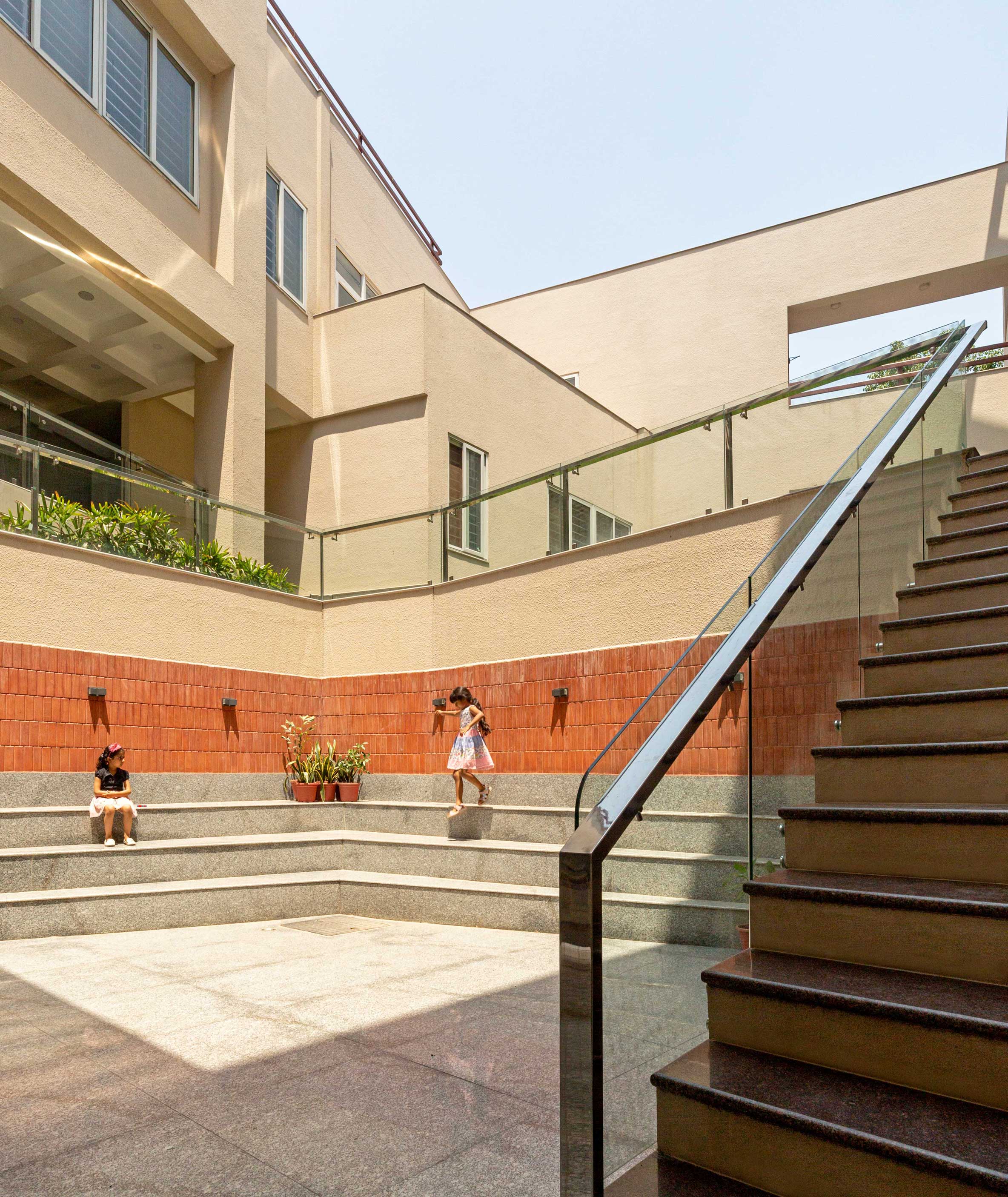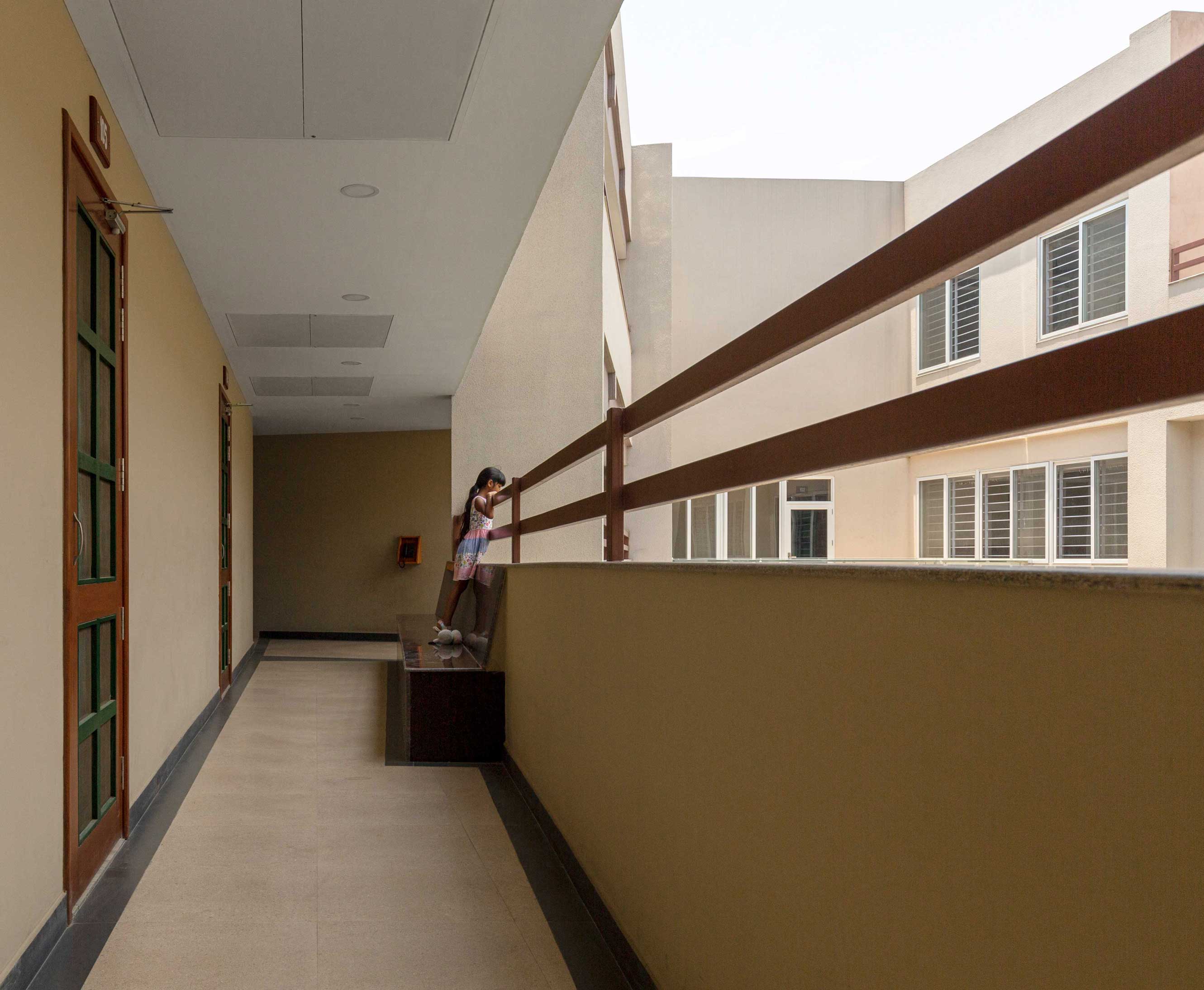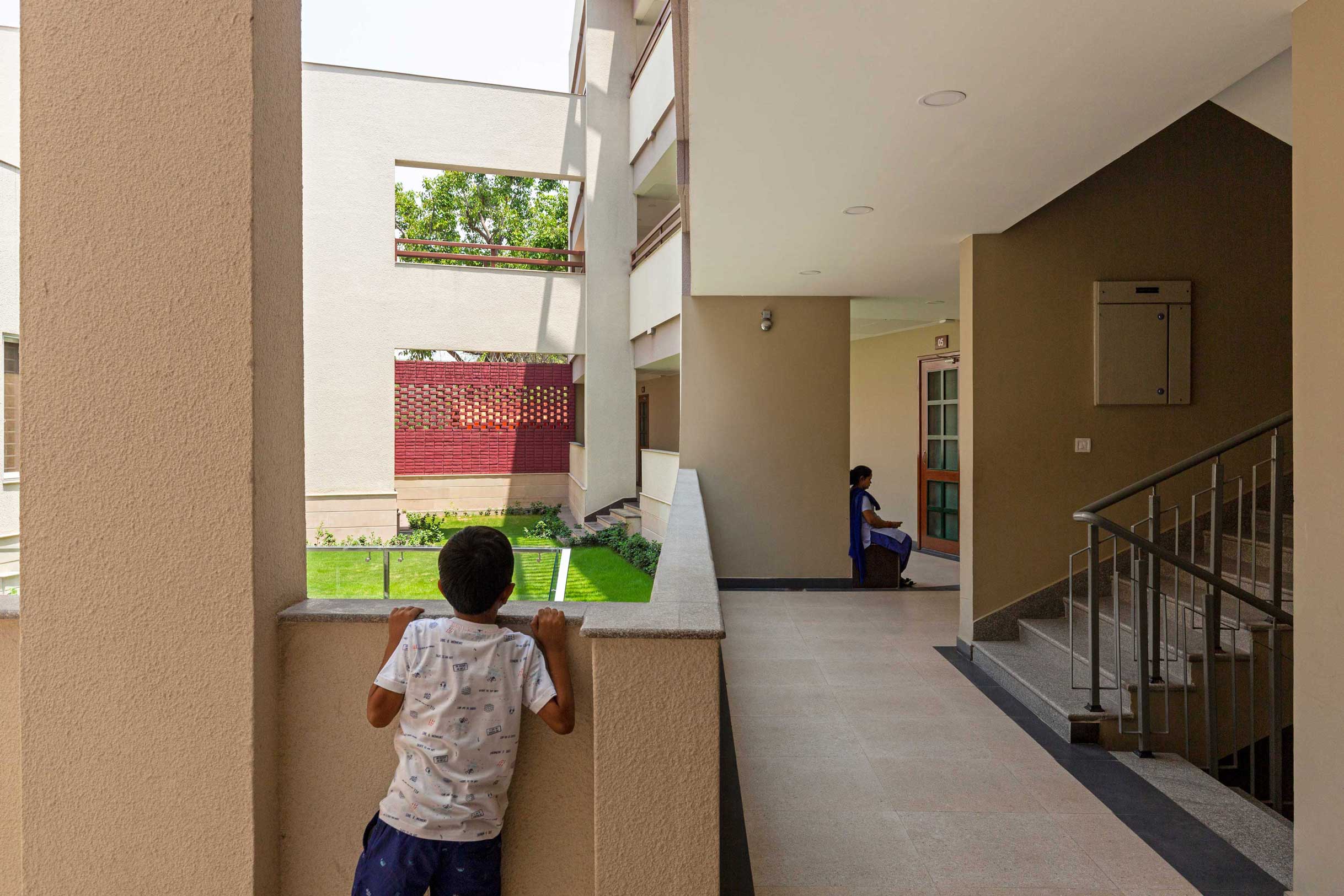 Activity areas like the common room, computer lab, and the games room are planned in the basement around the central courtyard and the sunken amphitheater, making it the liveliest zone in the building. The amphitheater has been designed as an extension of the common room, also functioning as a congregation spot where students and staff often come together to celebrate events or special occasions.  In order to ensure a nourishing and emotionally supportive  environment for the children, safety has been considered  as an essential part of the design. The warden’s residence is planned within the building, overlooking the central courtyard, while giving her a complete view of the hostel from her living room while retaining a sense of privacy. The number of building entry and exit points are reduced, windows are fitted with metal grills, and  wires are used between the handrails in the corridors and the ceiling as a precaution.