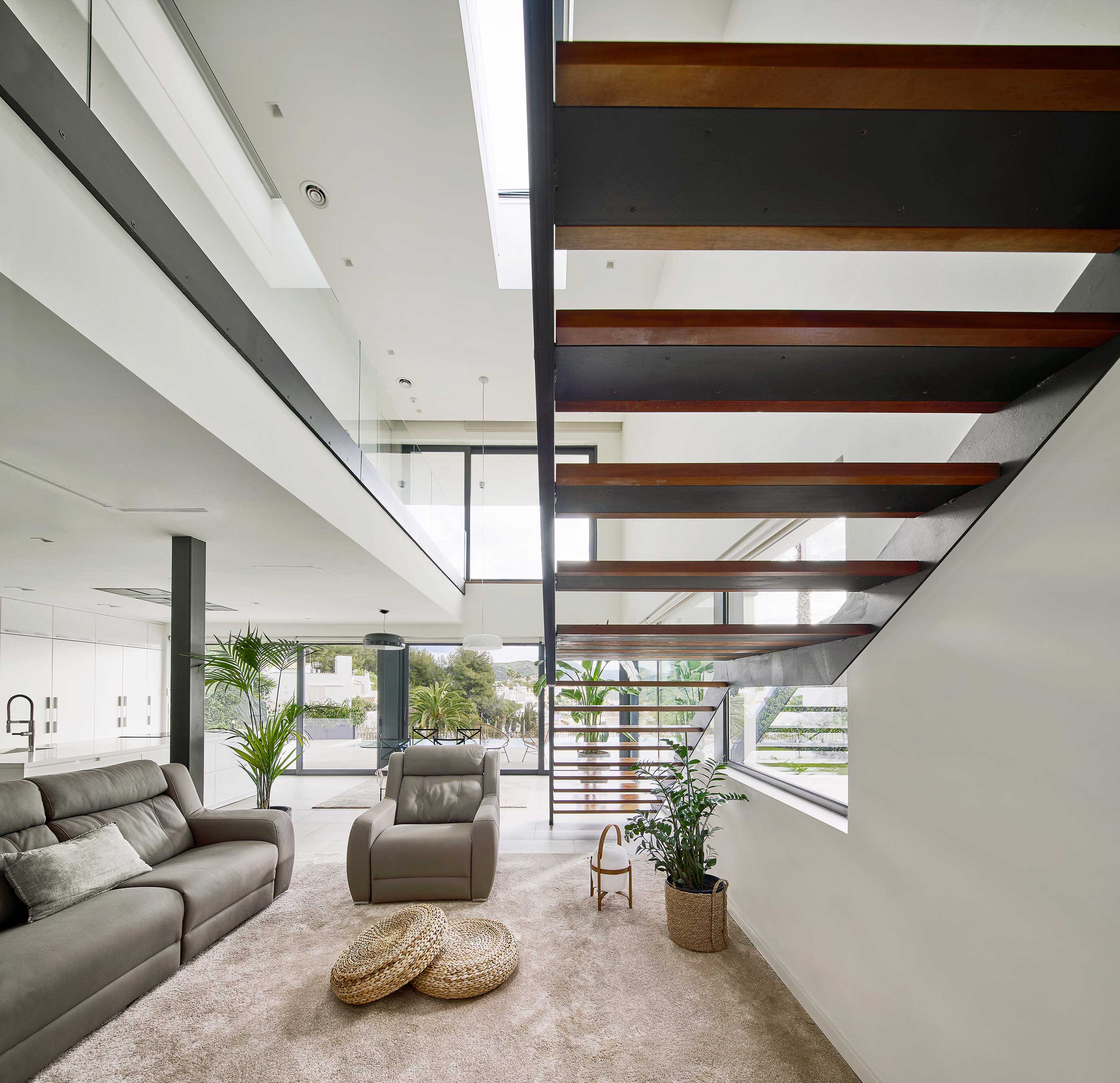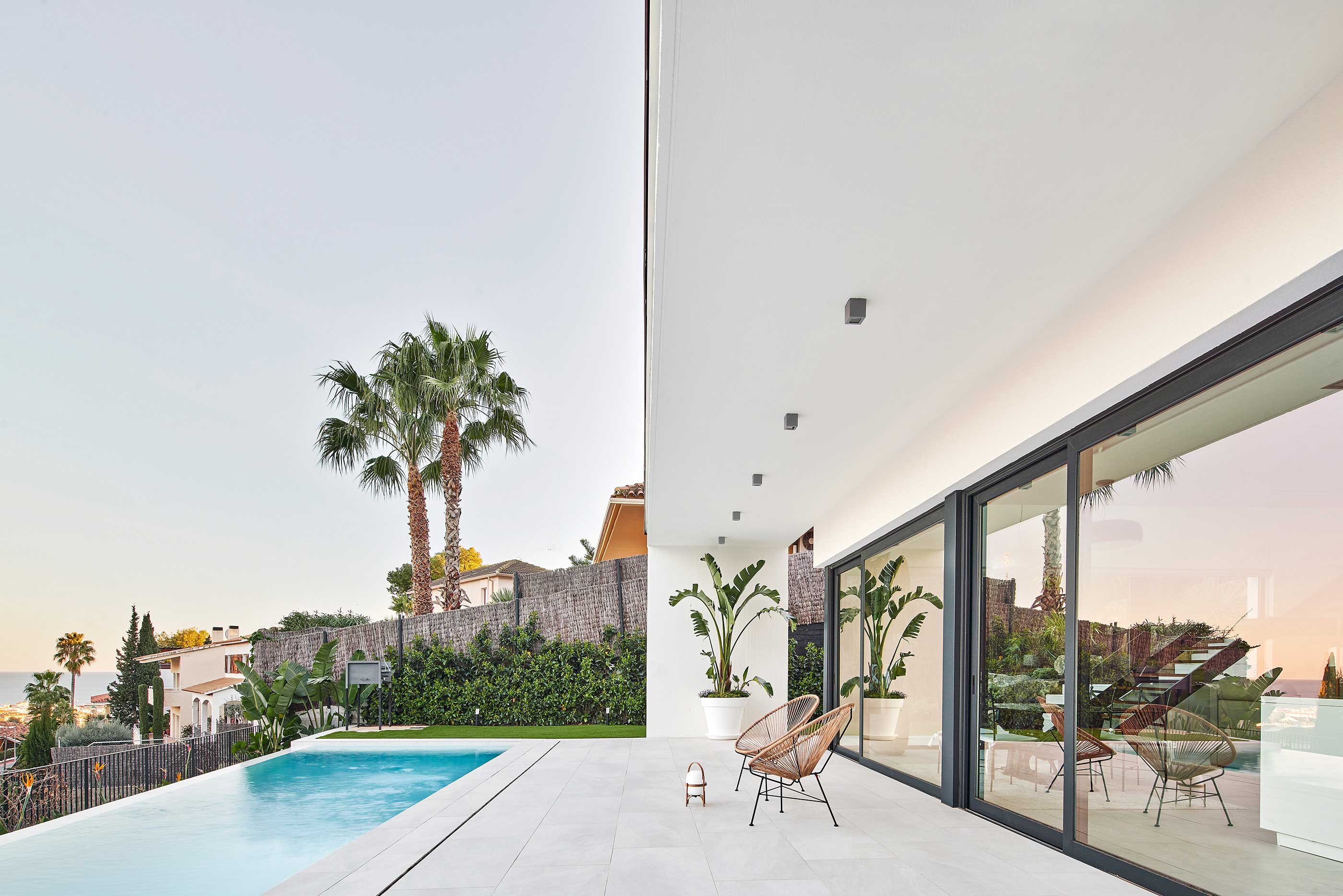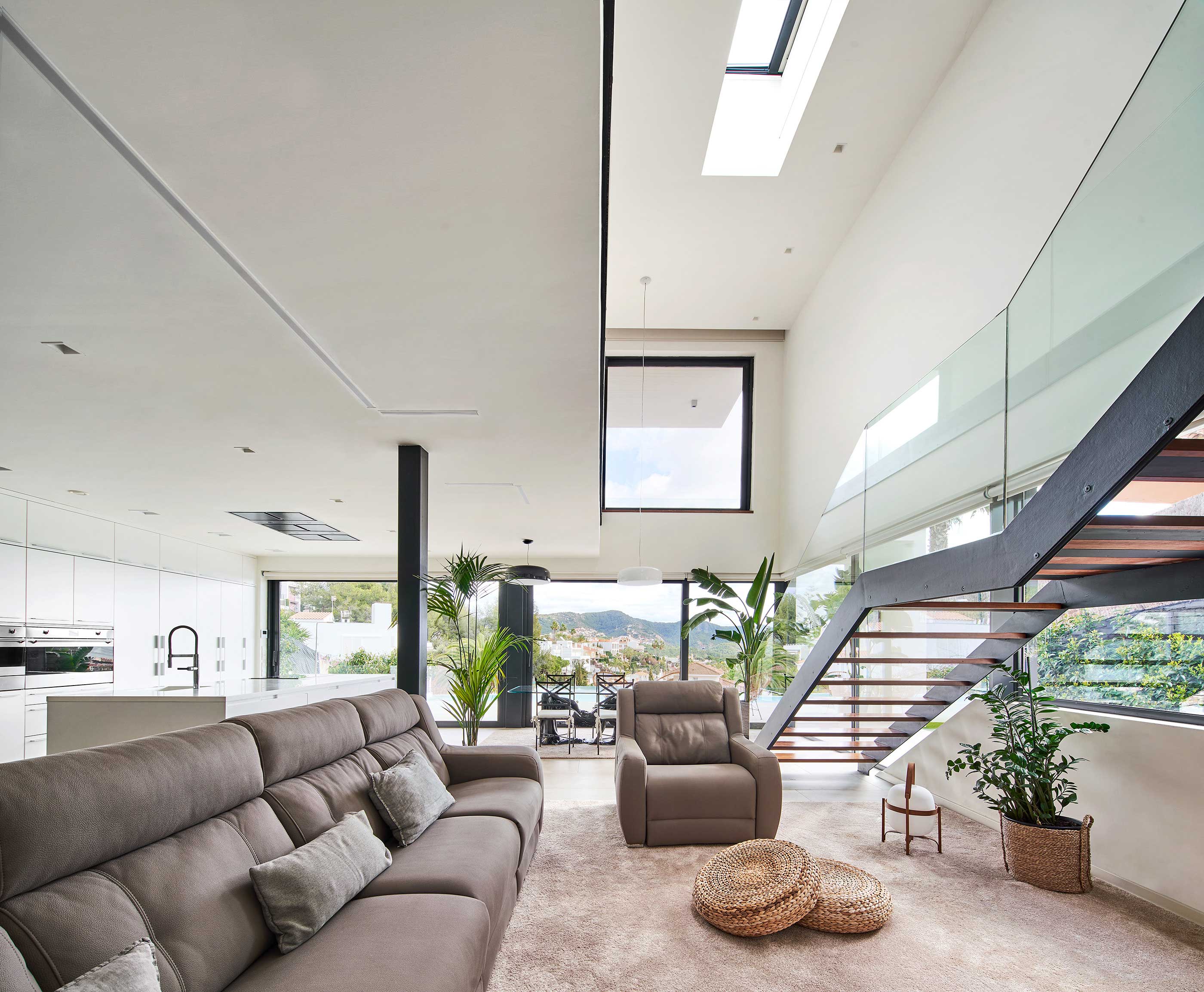 Energy efficiency has been a premise in the conception of this house. The project proposes, in terms of light control, both direct and indirect, openings that are distributed where thematically best can enhance the characteristics and visual and thermal needs of the property. The structure of the house itself provides passive solar architecture solutions, through porches of different dimensions. The rainwater from the roofs is collected in tanks and reused to irrigate the garden area. At the same time, the house integrates an air conditioning system using aerothermal technology, which together with the thermal insulation proposed in the roofs, the construction system itself and the exhaustive study of the composition of the different skins of the building, have made this house have obtained an energy certification A.